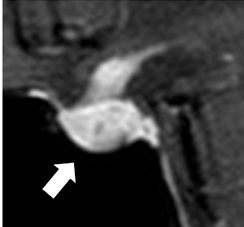 IgG4関連下垂体炎のMRI画像(T1強調、Gd造影)下垂体全体、下垂体茎の腫大、比較的均一な造影効果を認める。(矢印)。