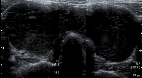 IgG4関連甲状腺炎の超音波(エコー)画像。甲状腺の両葉はびまん性に顕著に腫大し、内部は低~無エコー。